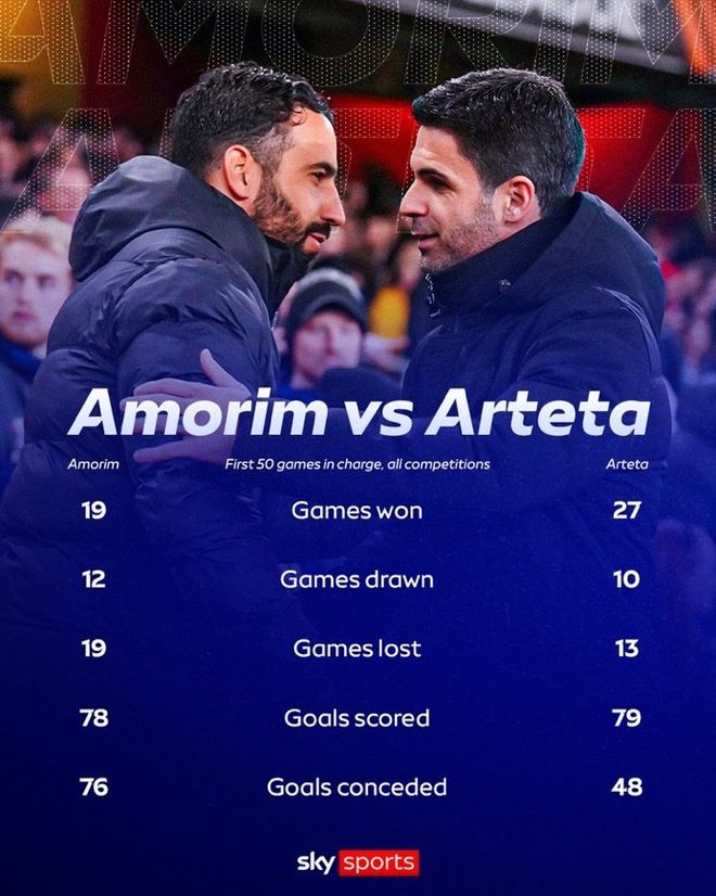 阿莫林執教曼聯前50場勝率38%,阿爾特塔同期勝率54%
