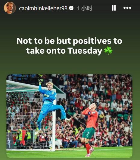比賽第75分鐘,特林康造點,C羅主罰點球被凱萊赫用腳擋出。凱萊赫曬出這張撲出C羅點球慶祝照,并配文:結果雖未如愿(愛爾蘭輸掉比賽),但周二仍將迎來積極影響。